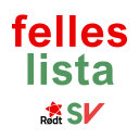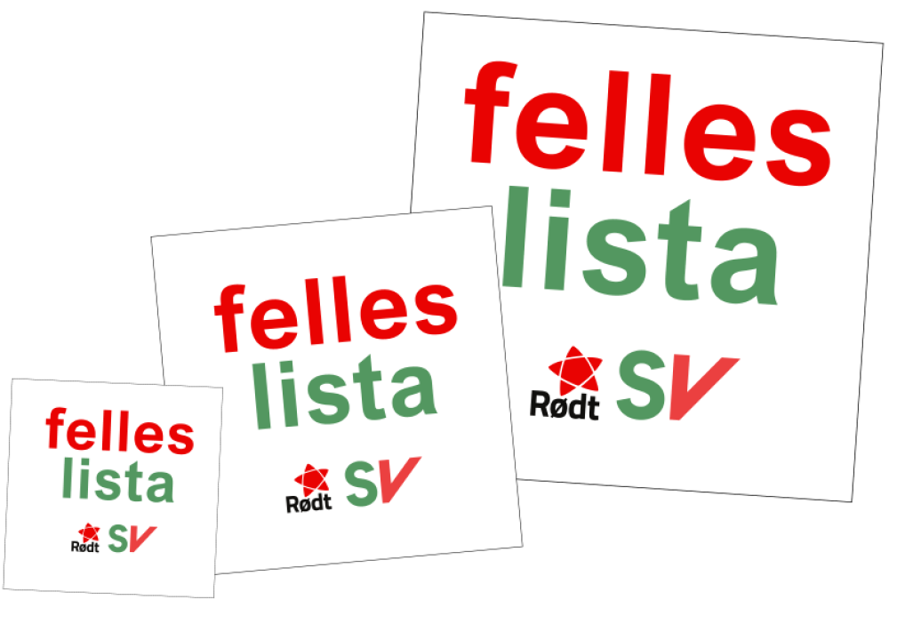 - Teksten “felleslista” er basert på skriftsnittet Arial Novo. Fargene er en miks av det røde i respektive Rødt og det grønne i SV sine logoer.